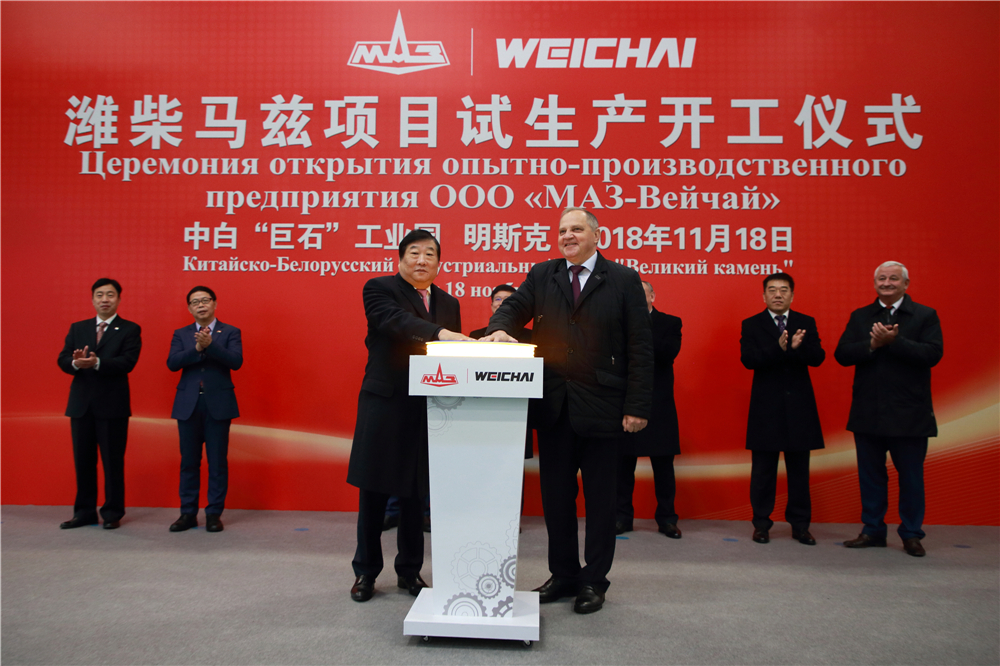 2018年11月18上午,濰柴馬茲項目試生產(chǎn)開(kāi)工儀式在中白工業(yè)園內隆重舉行,白俄羅斯共和國工業(yè)部部長(cháng)烏秋平,中國駐白俄羅斯特命全權大使崔啟明,中白工業(yè)園區管委會(huì )主任亞羅申科,濰柴控股集團有限公司董事長(cháng)譚旭光,馬茲集團總經(jīng)理卡特里尼奇,開(kāi)發(fā)公司總經(jīng)理李海欣等領(lǐng)導出席了本次活動(dòng)。在熱烈的掌聲中,烏秋平和崔啟明共同為濰柴馬茲項目揭牌,隨后,譚旭光與卡特里尼奇共同按下了象征項目投產(chǎn)的啟動(dòng)按鈕。