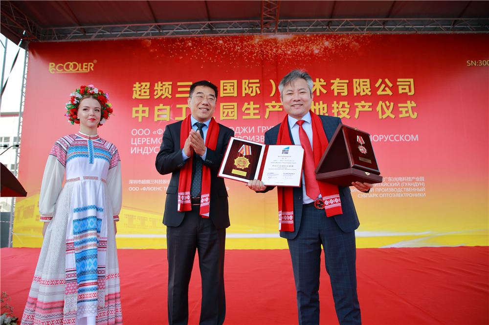 金秋十月,碩果累累。2018年10月19日上午,中白工業(yè)園入園居民企業(yè)超頻三(國際)技術(shù)有限公司在園區舉辦生產(chǎn)基地投產(chǎn)儀式。白俄羅斯共和國經(jīng)濟部副部長(cháng)馬圖謝維奇,廣東省商務(wù)廳副廳長(cháng)陳越華,中白工業(yè)園區管委會(huì )主任亞羅申科,開(kāi)發(fā)公司總經(jīng)理李海欣,明斯克州政府經(jīng)濟委員會(huì )主任熱列茲尼雅克,廣東省光電照明協(xié)會(huì )會(huì )長(cháng)吳文鋒,超頻三股份公司董事長(cháng)杜建軍等領(lǐng)導出席了本次活動(dòng),并為項目的順利投產(chǎn)剪彩。李海欣向杜建軍頒發(fā)了中白工業(yè)園“巨石獎牌”和證書(shū)。