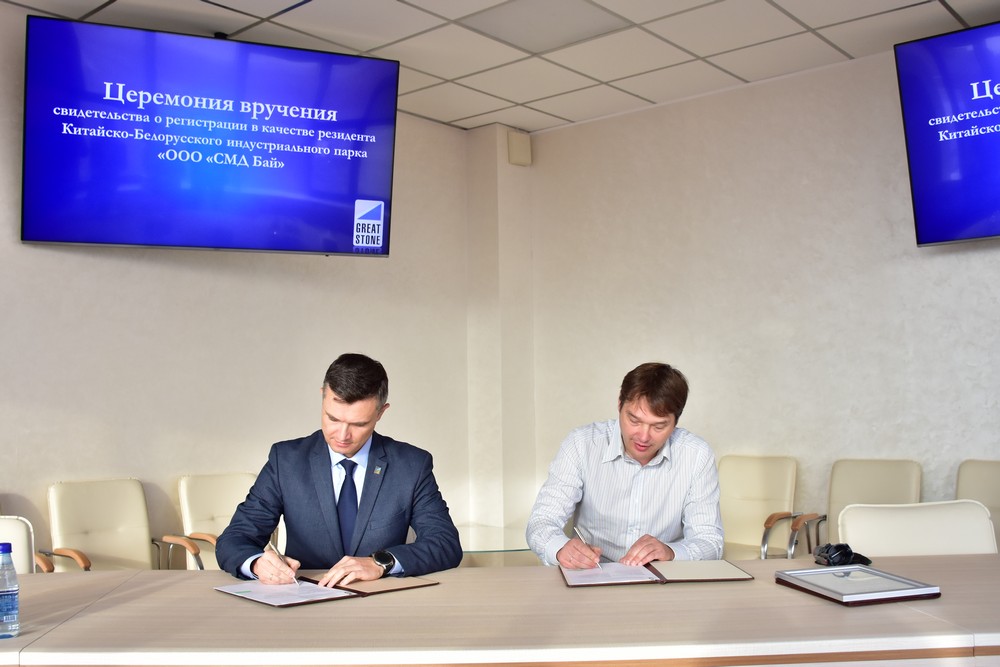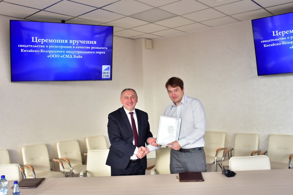 10 月 21 日,SMD BY有限責任公司注冊成為中白工業(yè)園第80家居民企業(yè),園區管委會(huì )主任亞羅申科向總經(jīng)理赫瓦利科·謝爾蓋頒發(fā)了入園證書(shū)。