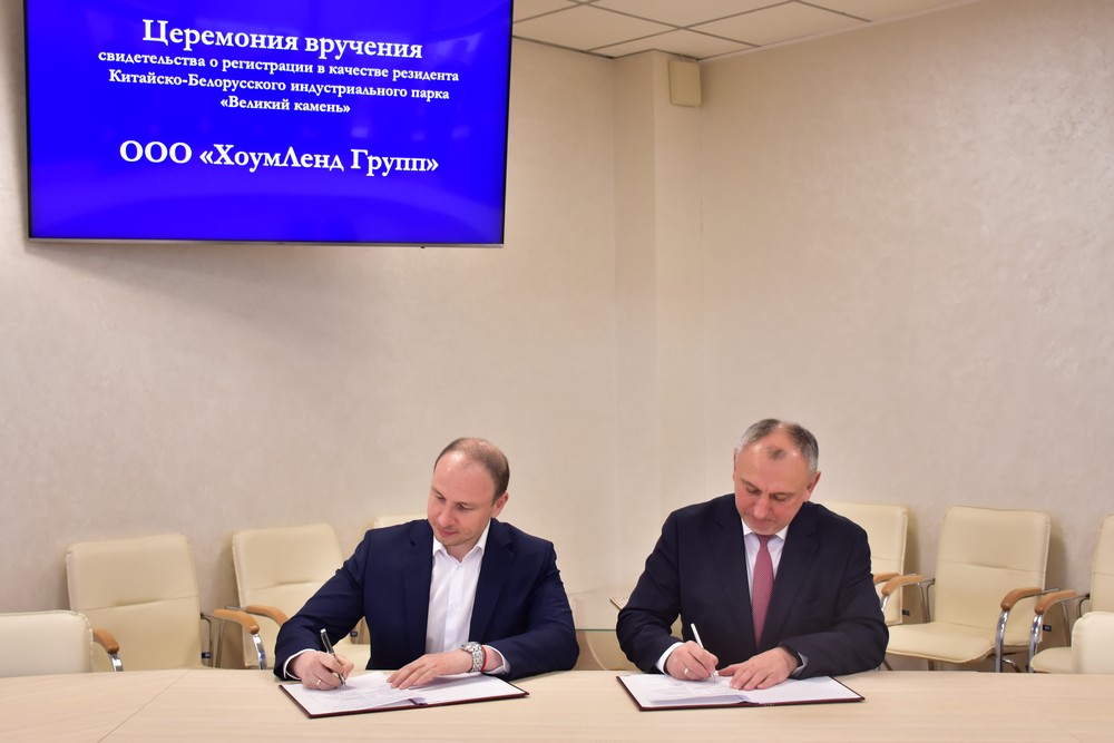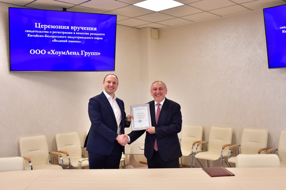 4月6日,HomeLand集團有限責任公司注冊成為中白工業(yè)園第88家居民企業(yè),園區管委會(huì )主任亞羅申科向HomeLand集團有限責任公司總經(jīng)理德米特里·維塔利頒發(fā)入園證書(shū),開(kāi)發(fā)公司總經(jīng)理李鐘漢出席入園儀式。