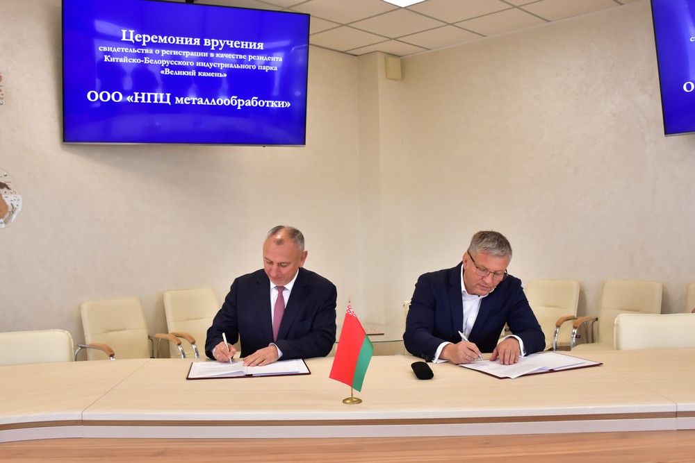 9 月 19 日,白俄羅斯金屬加工科研生產(chǎn)中心有限責任公司注冊成為園區第94家居民企業(yè),園區管委會(huì )主任亞羅申科向該項目創(chuàng )始公司的第一副總經(jīng)理德米特里·布爾博頒發(fā)入園證書(shū)。