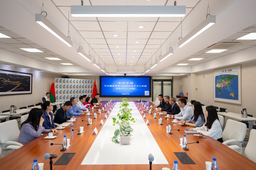 2023年7月28日,中國商務(wù)部世貿司副司長(cháng)陳雨松率中白服務(wù)貿易與投資協(xié)定工作組考察中白工業(yè)園,與園區開(kāi)發(fā)公司總經(jīng)理李鐘漢舉行會(huì )談。