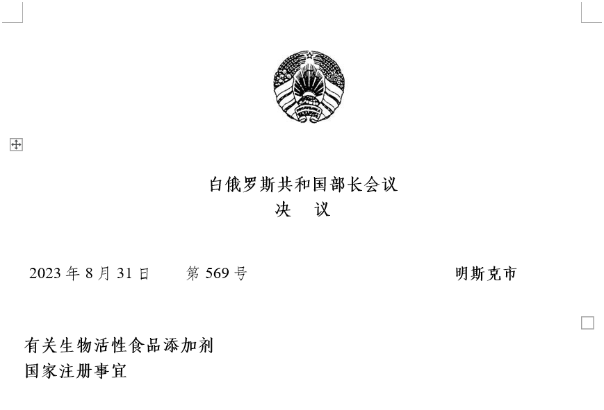 2023年8月31日第569號白俄羅斯共和國部長(cháng)會(huì )議決議對“中華人民共和國產(chǎn)生物活性食品添加劑在白注冊制度”予以批準。根據該制度,在中國生產(chǎn)并注冊的生物活性食品添加...202309-05