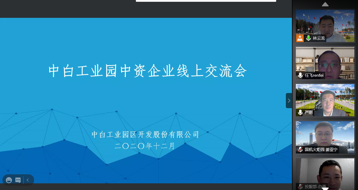 2020年12月2日下午,中白工業(yè)園開(kāi)發(fā)公司通過(guò)視頻組織召開(kāi)中資居民企業(yè)第四季度安全生產(chǎn)及防疫專(zhuān)題會(huì )。開(kāi)發(fā)公司總經(jīng)理嚴剛及各中資居民企業(yè)負責人出席本次會(huì )議,會(huì )議...202012-02