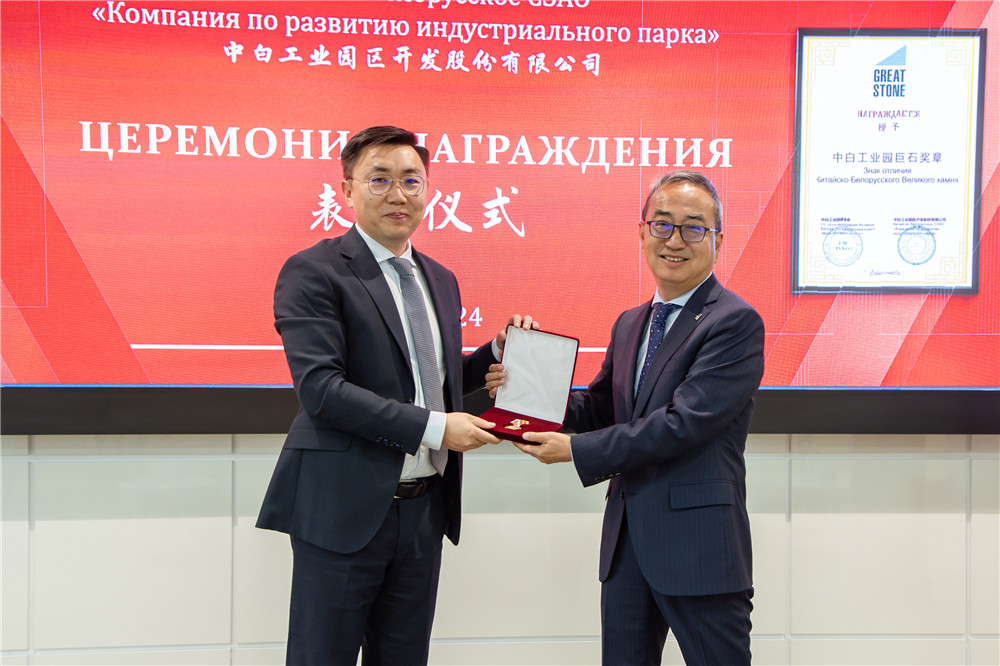 2024年6月24日,中白工業(yè)園巨石獎?wù)骂C授儀式在園區舉行,園區開(kāi)發(fā)公司總經(jīng)理李鐘漢向即將離任的公司副總經(jīng)理吳鵬頒授巨石獎?wù)潞妥C書(shū),園區開(kāi)發(fā)公司第一副總經(jīng)理卡羅...202406-24